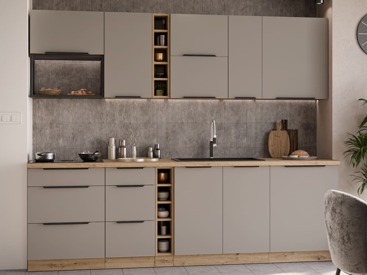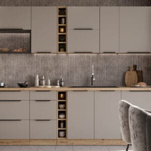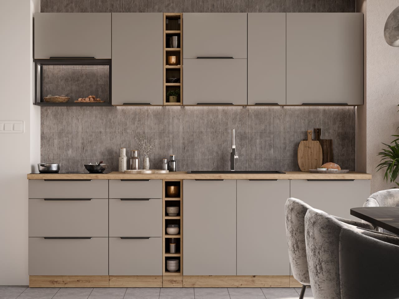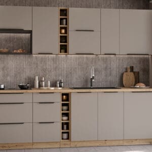 - Sladěné provedení: Dekor Dub Artisan / Písková Šedá AFM pro jednotný vzhled kuchyně.