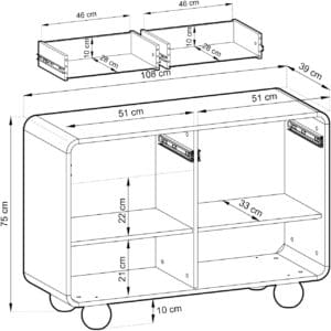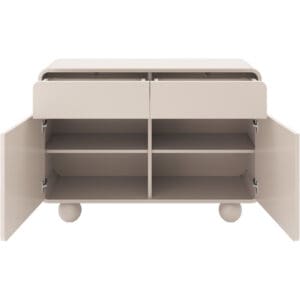 Komoda 108 ROND 04 v kašmírovém provedení kombinuje čisté linie s praktickými funkcemi vhodnými pro dlouhodobé a univerzální používání. Díky push-to-open systému a plnému výsuvu zásuvek je manipulace plynulá a intuitivní, zatímco povrch z laminované dřevotřísky a MDF s ABS ohraněním usnadňuje každodenní péči.