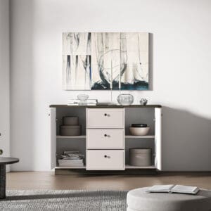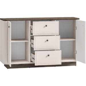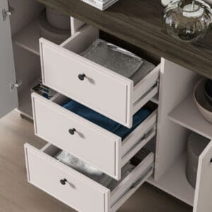 - Kombinace dvířek a šuplíků: umožňuje přehledné uspořádání věcí různých rozměrů.
