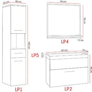 LP1 – Skříňka vysoká (30/140/32) LP2 – Skříňka pod umyvadlo (60/46/35) LP4 – Koupelnové zrcadlo (56/56/12) |