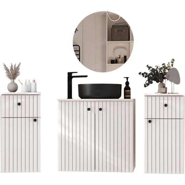 Skříňka pod umyvadlo ASTO 02 (60/58/36) Koupelnová skříňka ASTO 03 (30/60/32) x2 Kulaté koupelnové zrcadlo MIR2 (60/60) |