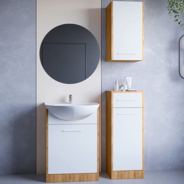 SL2 – Skříňka pod umyvadlo (52/74/30) SL3 – Skříňka nízká (34/90/30) SL4 – Skříňka závěsná (34/60/30) MIR2 – Kulaté koupelnové zrcadlo (60/60) |