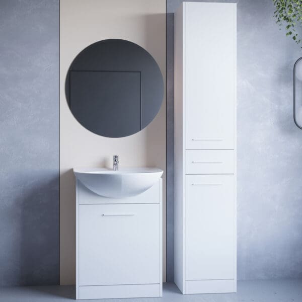 SL1 – Skříňka vysoká (34/180/30) SL2 – Skříňka pod umyvadlo (52/74/30) MIR2 – Kulaté koupelnové zrcadlo (60/60) |