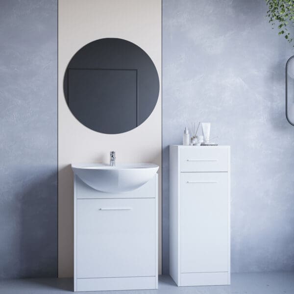 SL2 – Skříňka pod umyvadlo (52/74/30) SL3 – Skříňka nízká (34/90/30) MIR2 – Kulaté koupelnové zrcadlo (60/60) |