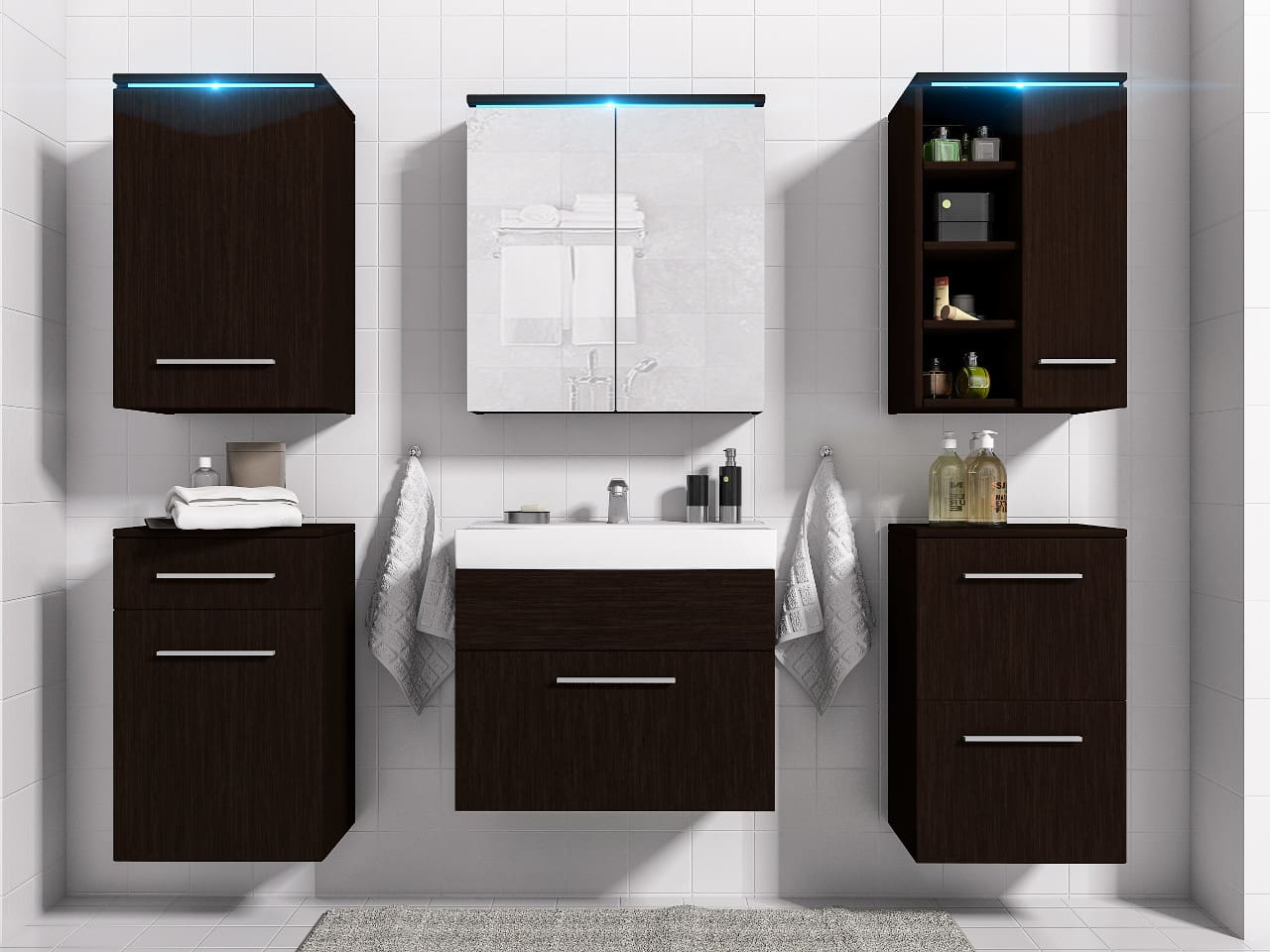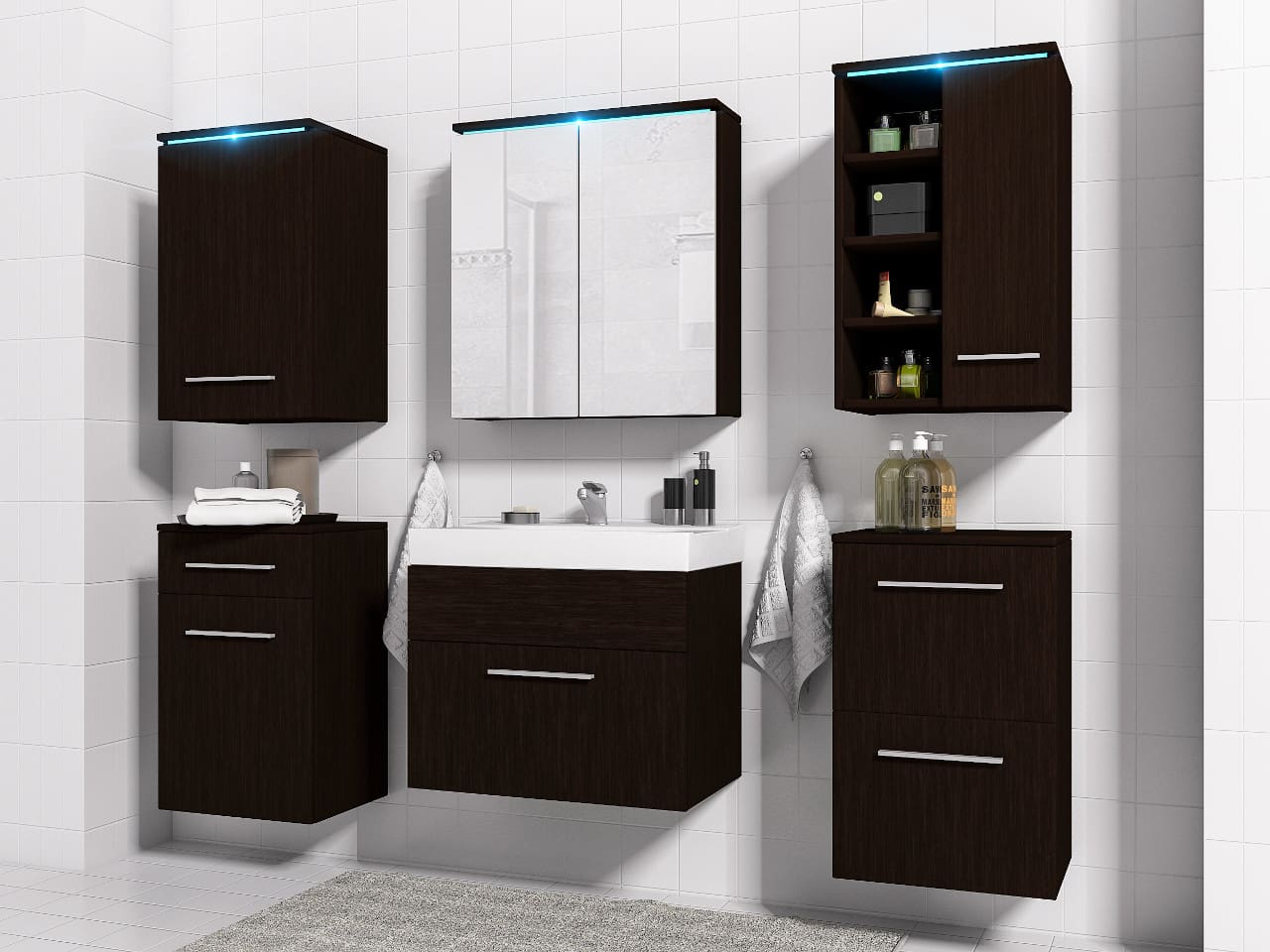 – Skříňka horní Levá (40/64/32) – Skříňka horní se zrcadlem (60/64/15) – Skříňka horní Pravá (40/64/32) – Dolní skříňka Levá (40/64/32) – Skříňka pod umyvadlo (60/51/35) – Dolní skříňka Pravá (40/64/32) |