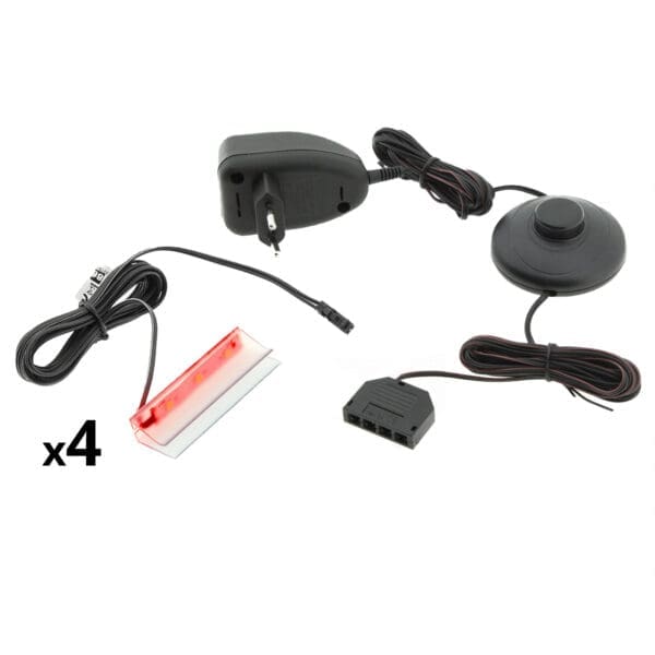– 4 x klip LED PCV s dvoumetrovým kabelem zakončeným zástrčkou MINI LED – Zdroj napájení LED s kabelem, nožním spínačem a rozbočovačem |