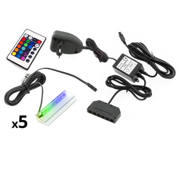 – 5 x klip LED RGB s dvoumetrovým kabelem zakončeným zástrčkou MINI LED – Zdroj napájení – Dálkový ovládač |
