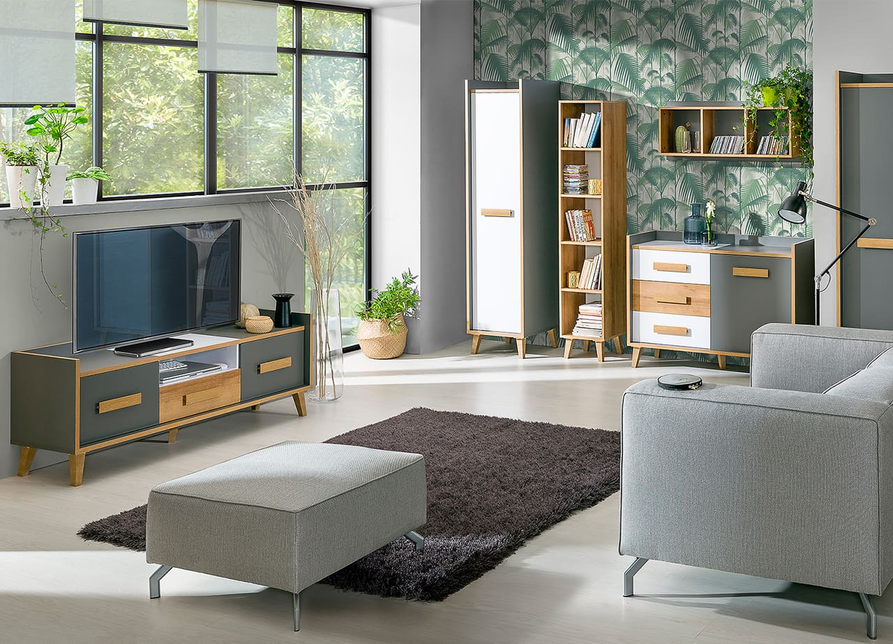 SKU: WERSO 4 Meble do salonu antracyt / dąb riviera / biały brylantowy