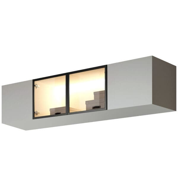 Korpus: Laminovaná dřevotříska 16mm Dvířka: MDF 18mm lakovaný, tvrzené sklo v barvě Grafit antisol |