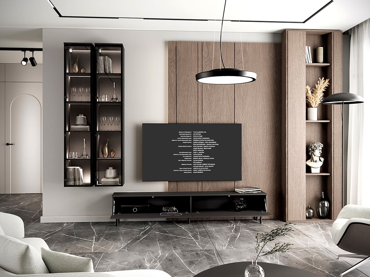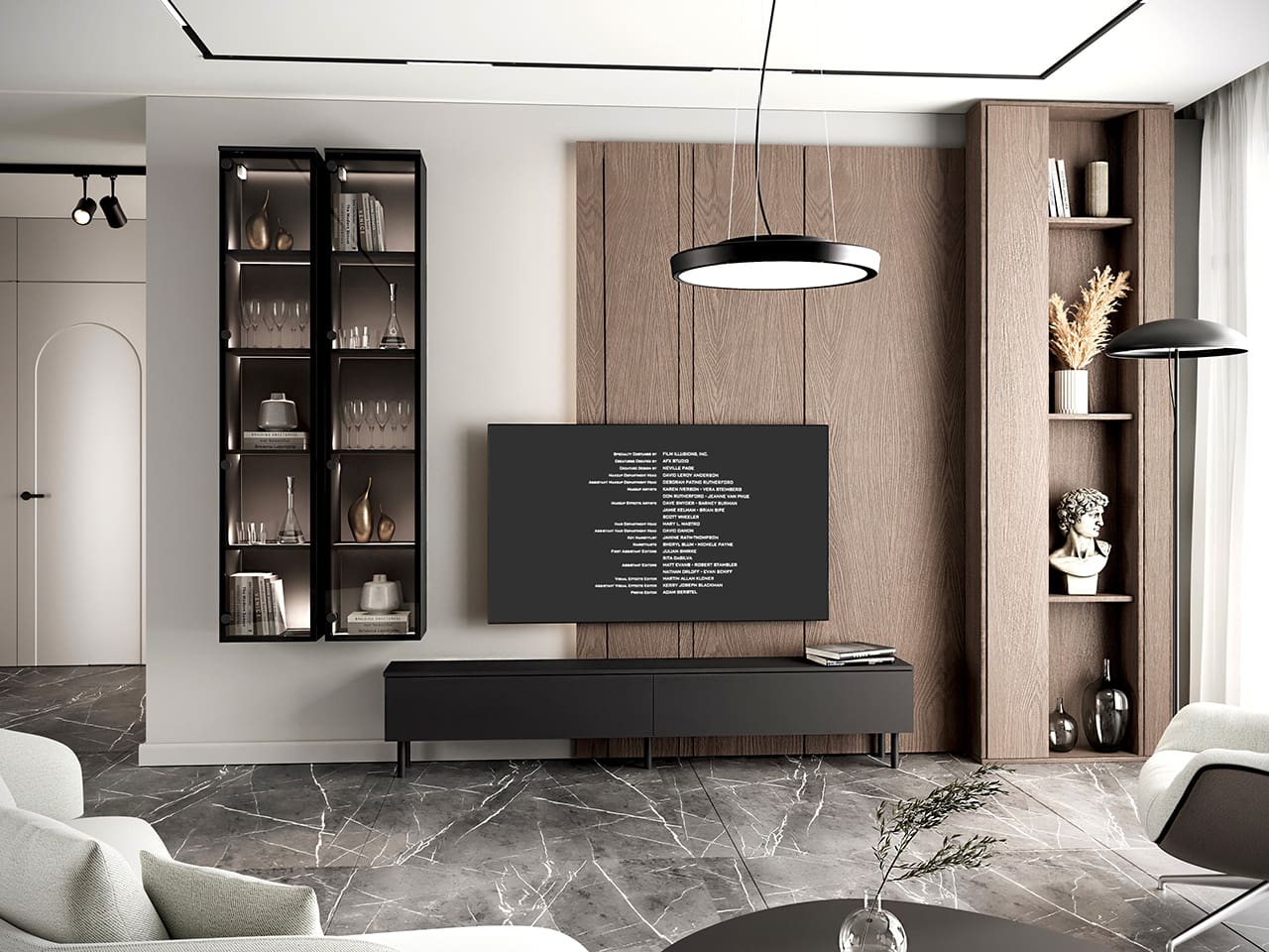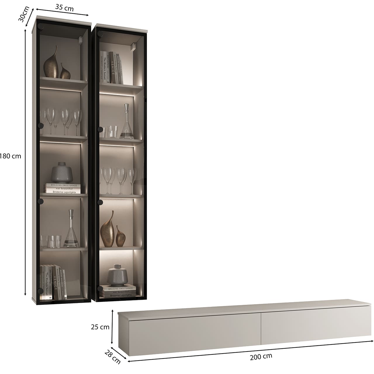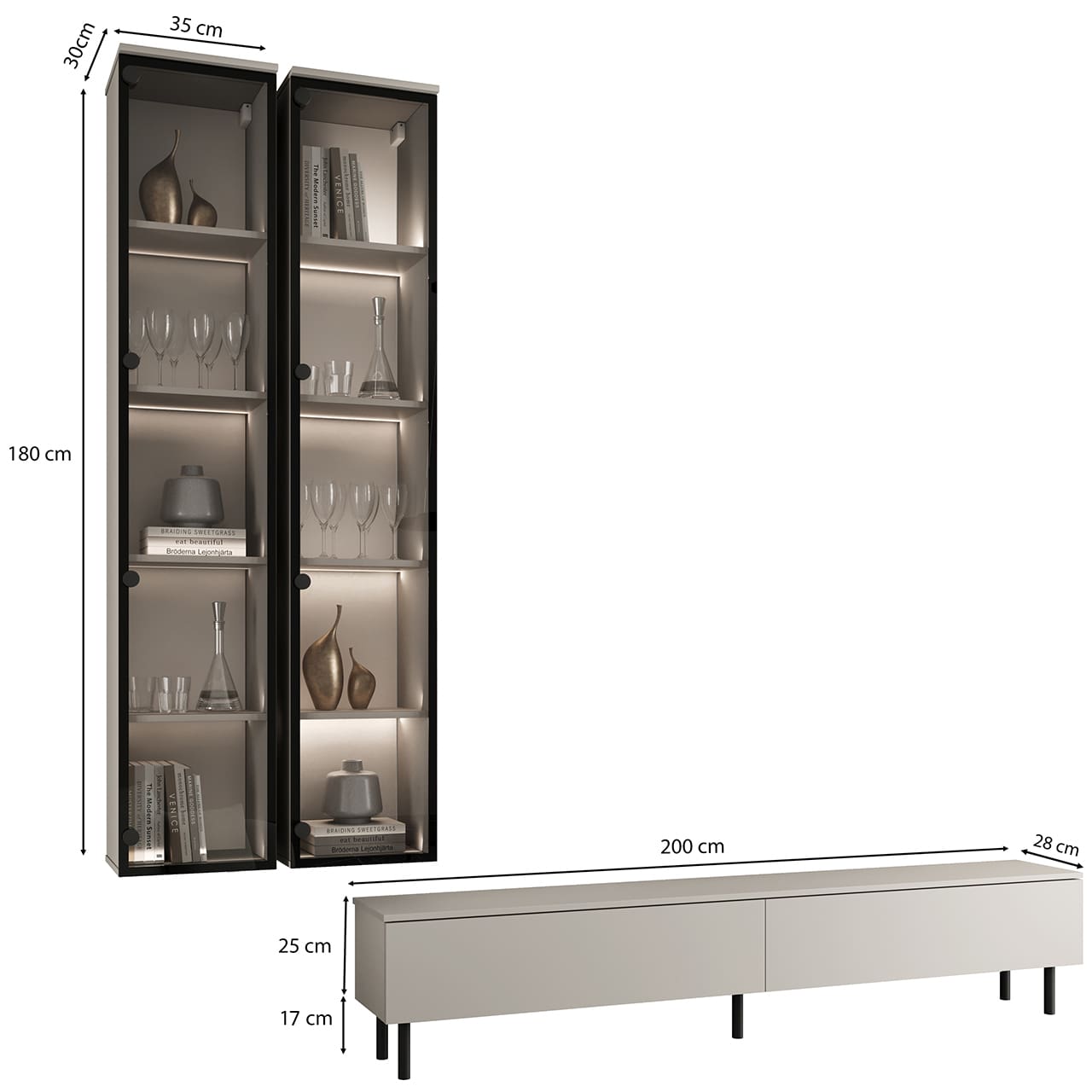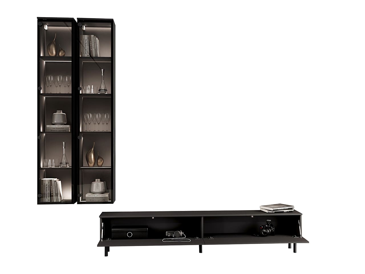 Komoda pod TV 200 FIGO 01 (200/25-42/28) Závěsná vitrína FIGO 03 (35/180/30) x2 |
