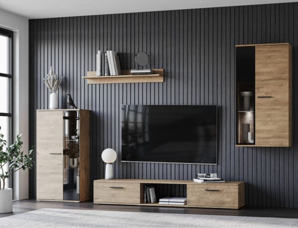 Vitrína stojící (59,3/115/30,6) Závěsná police (102/16/17,5) Závěsná vitrína (59,3/113/30,6) Komoda pod TV (175,5/27,7/40,2) |