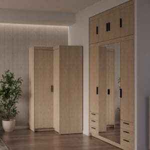 Prostorově orientované řešení: Hodí se do místností, kde chcete efektivně využít roh — například v předsíni, šatně nebo ložnici. V menších prostorách pomůže uvolnit stěny a v rozlehlejších pokojích nabídne doplňkový úložný segment bez narušení celkového vzhledu.