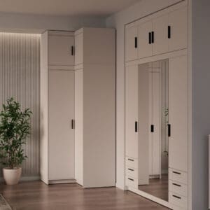 Prostorová orientace: Hodí se všude tam, kde stojí rohová skříň a je potřeba ji opticky dokončit. Může ulehčit plánování nábytku v menších i větších místnostech tím, že využívá roh a vytváří plynulý přechod mezi stěnami a skříní.