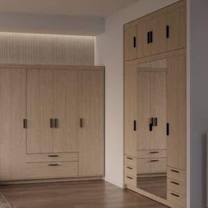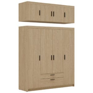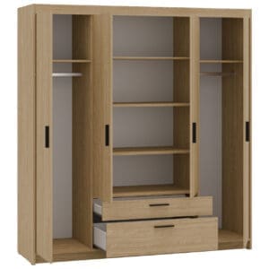 Skříň ELENI 4D2S v dekoru dub olejový je navržena tak, aby každodenní manipulace s oděvy byla co nejpohodlnější. Promyšlené uspořádání a použité prvky v technických údajích pomáhají rychle najít a vyjmout oblečení bez zbytečného přeskupování.