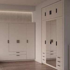 Neutrální pískový dekor přispívá k nenápadnému vzhledu, který se snadno integruje do ložnice, šatny i větší předsíně.