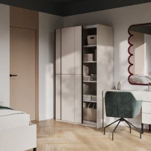 Skříň je navržena tak, aby dobře sloužila v dětském pokoji nebo v dalších obytných prostorech, kde je potřeba kompaktní úložný prostor. Hodí se tam, kde chcete využít stěnu efektivně bez nutnosti velkého výsuvu dveří do prostoru.