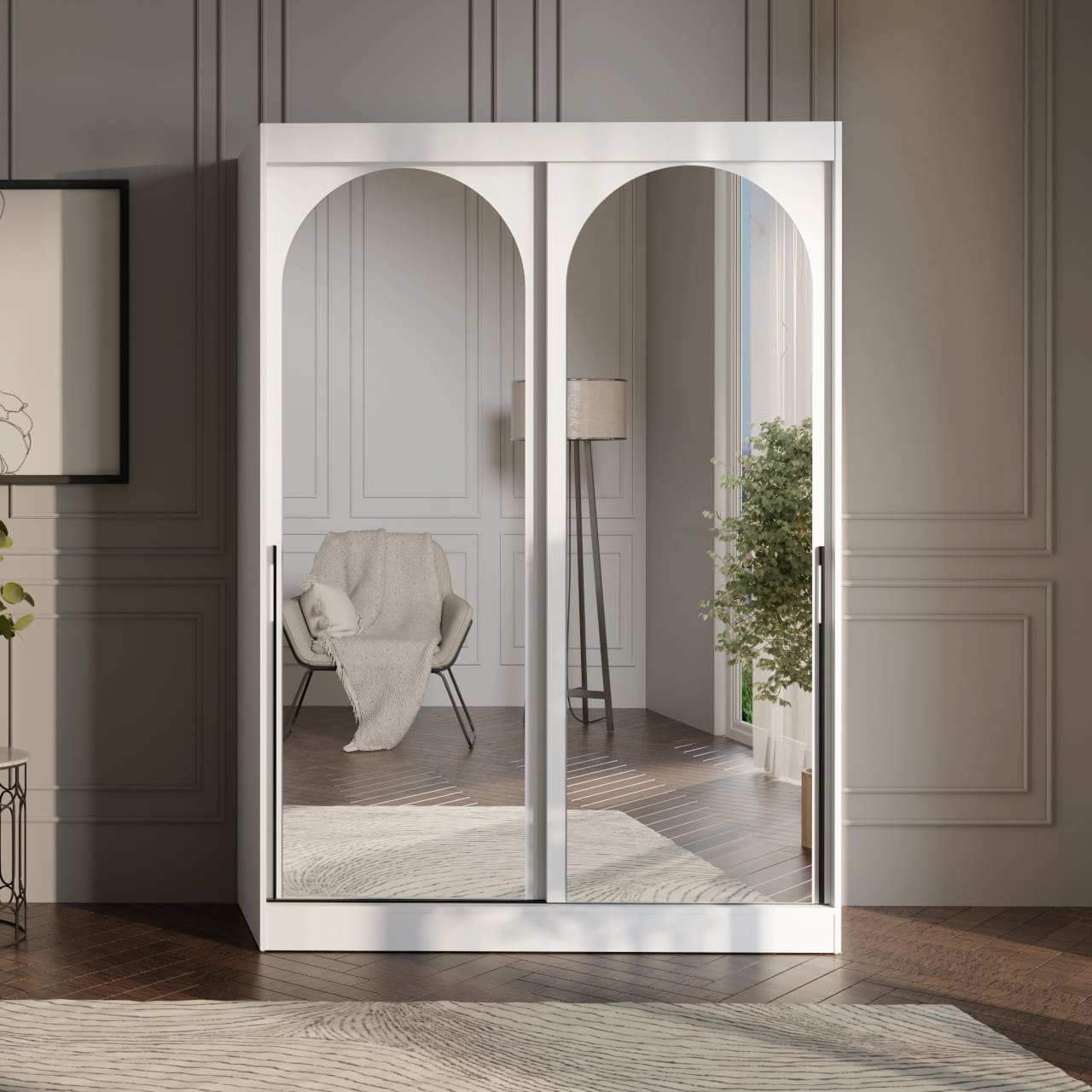 - Dvě zrcadlové plochy: praktické pro kontrolu oděvu a optické zvětšení prostoru.