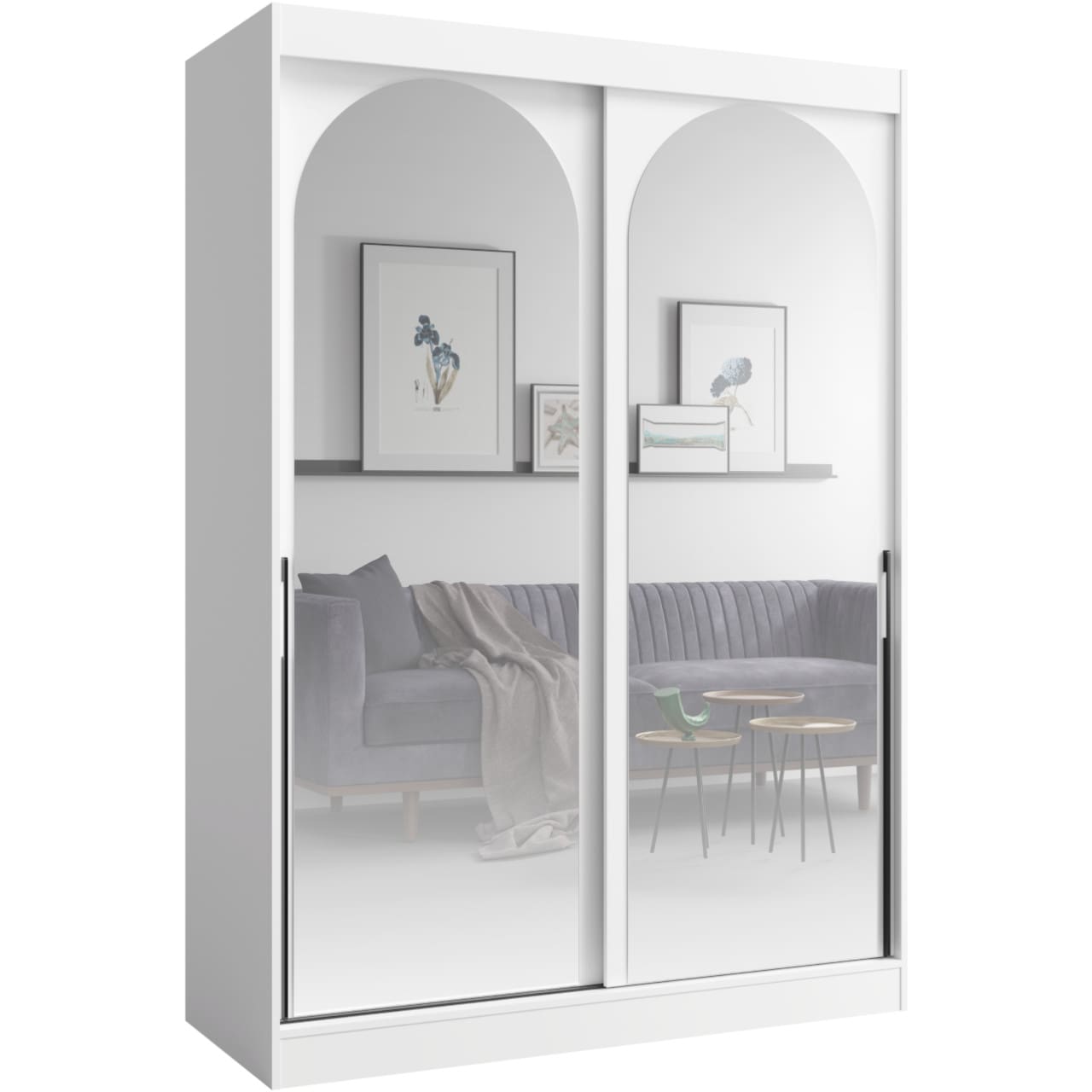 Skříň s posuvnými dveřmi MOGI 150 v bílém provedení s černými úchytkami je navržena pro snadné a přehledné každodenní používání. Dvě zrcadlové plochy pomáhají při rychlé kontrole vzhledu a hliníkové kolejnice přispívají k plynulému posuvu dveří, takže se skříň snadno ovládá i při častém používání.