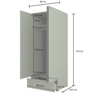 Před umístěním ověřte průchod dveřmi a volný prostor v místnosti vzhledem k rozměrům 89cm × 210cm × 60cm. Skříň má spodní šuplík s válečkovým vedením a neobsahuje samostatnou úchytku. Uvedené materiály a technické údaje najdete v sekci výše; záruka produktu je 24 měsíců.
