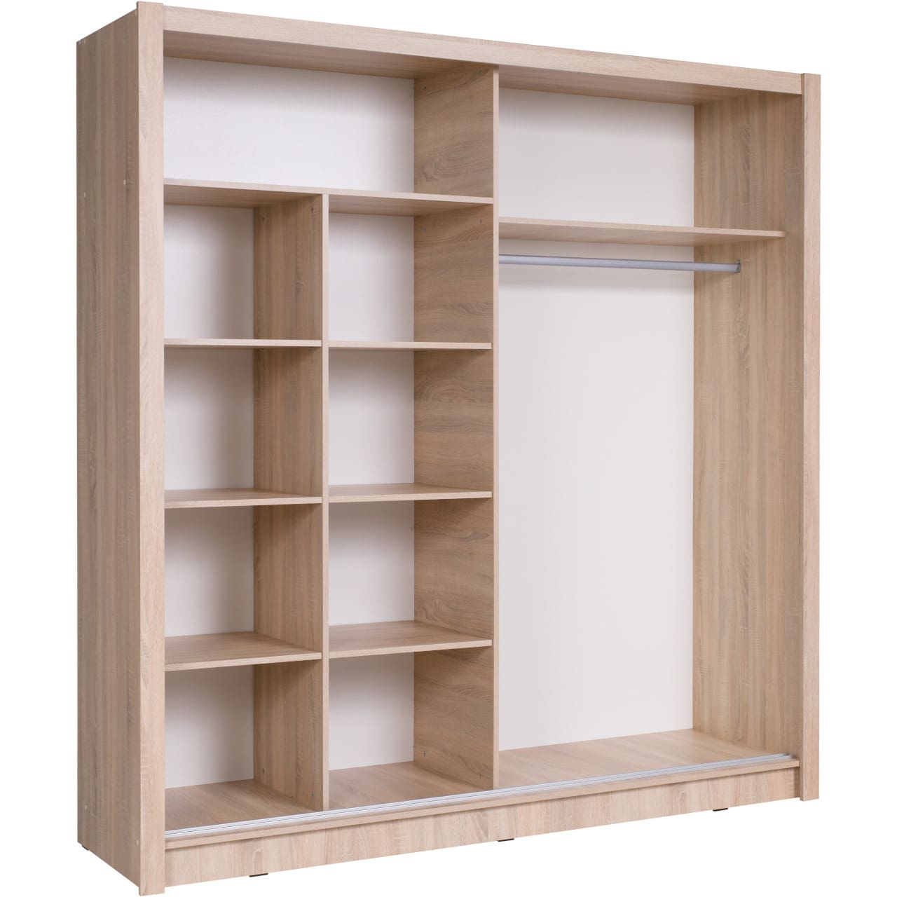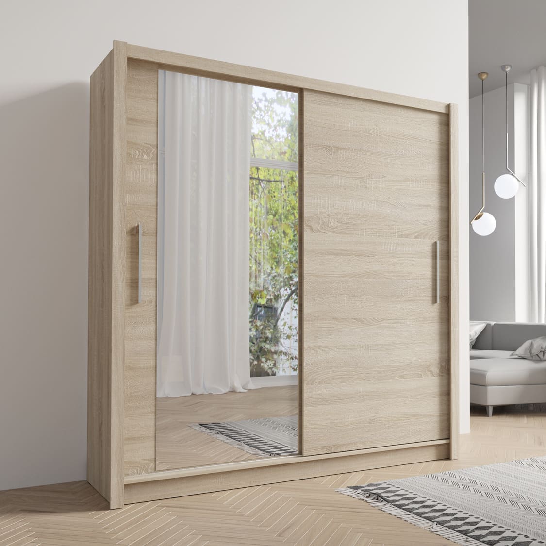 Skříň se zrcadlem 154 BAKI 10 v dekoru dub sonoma je navržena tak, aby usnadnila každodenní oblékání a péči o oděv. Velké zrcadlo na dveřích umožňuje rychlou kontrolu vzhledu, posuvné dveře šetří prostor a šatní tyč zajišťuje pohodlné uložení ramínkového oblečení.