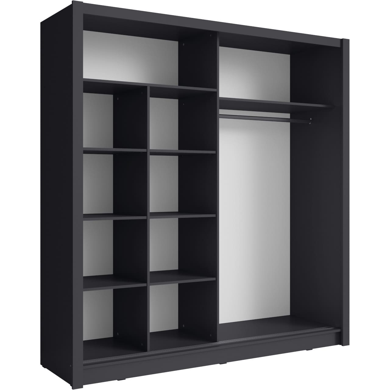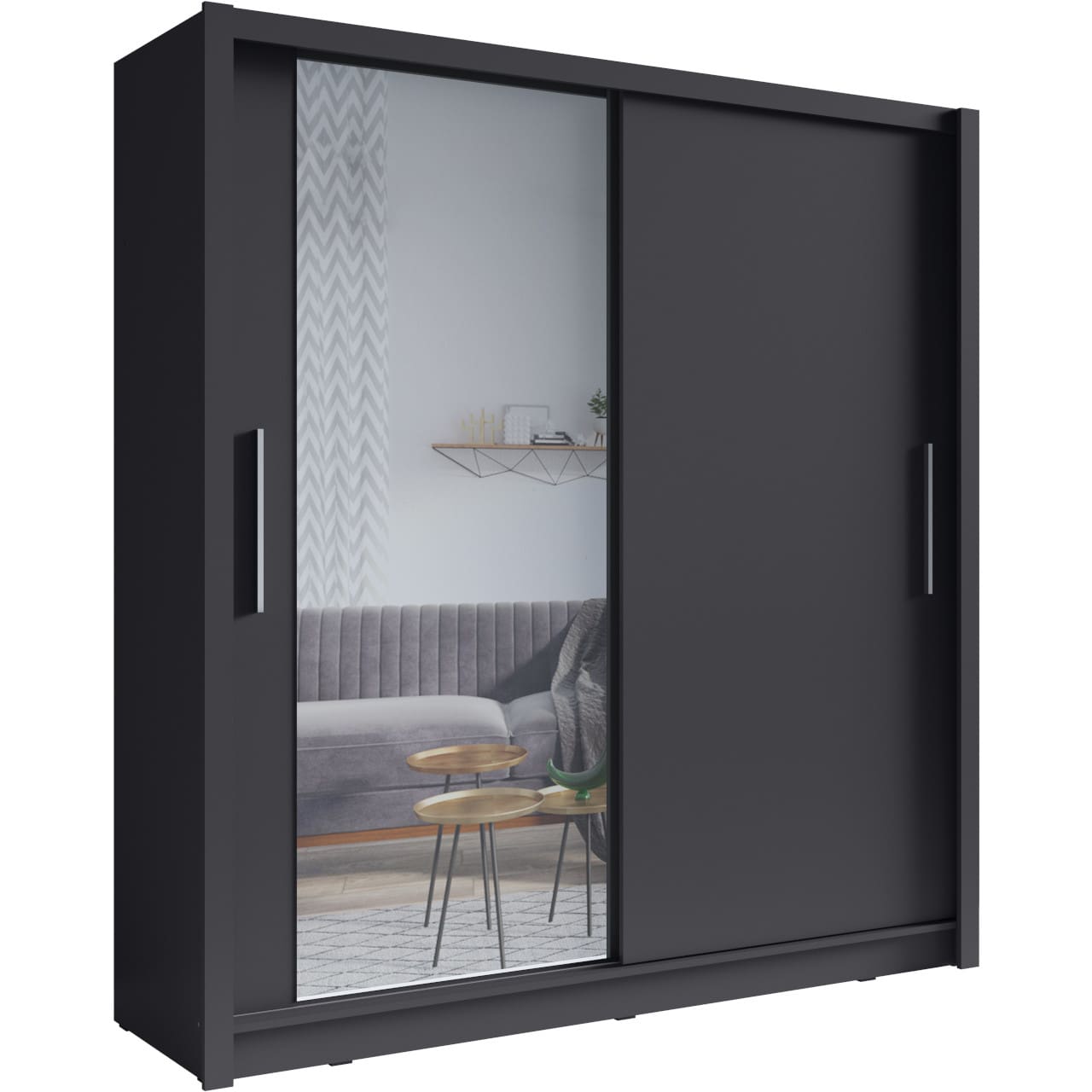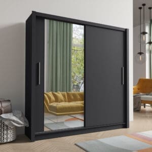 Skříň se zrcadlem BAKI 10 v odstínu šedý grafit je navržena tak, aby efektivně využila stěnu a opticky zvětšila prostor díky integrovanému zrcadlu. Posuvné dveře zajišťují pohodlný přístup bez potřeby volného prostoru před skříní, což usnadní plánování i v menších místnostech.