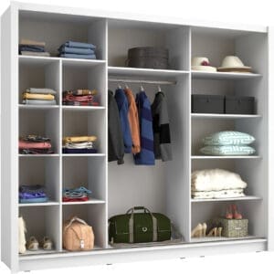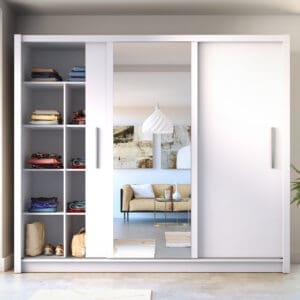 Posuvná skříň se zrcadlem 248 BAKI 13 v bílé je navržena pro každodenní, praktické používání v domácnosti. Díky posuvným dveřím a integrovanému zrcadlu poskytuje přehledné a snadno přístupné řešení pro ukládání oděvů i doplňků, aniž by zabírala zbytečný manipulační prostor před nábytkem.