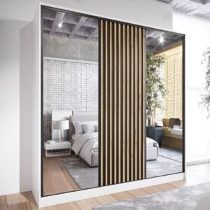 SKU: Szafa przesuwna 180 biały/wotan/czarny;1lamel+2lustra;szuflady