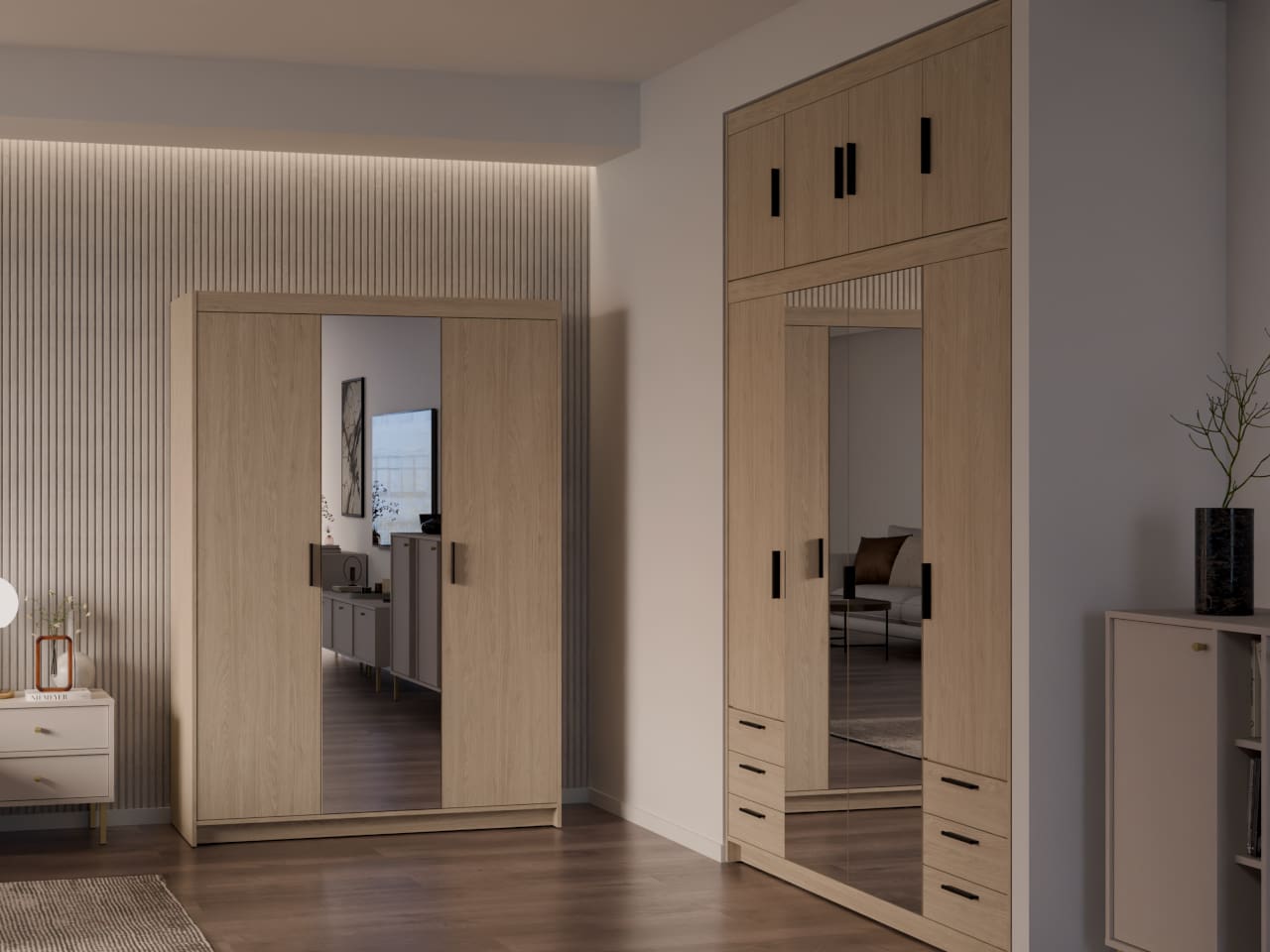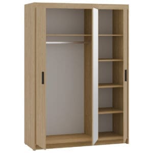Skříň se zrcadlem ELENI 3D olejovaný dub je navržena pro jednoduché a přehledné uložení oděvů s integrovaným zrcadlem pro pohodlné používání. Kombinuje přístupnost obsahu a vizuální kontrolu při oblékaní, aniž by zabírala zbytečně mnoho místa.