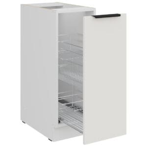 Vnitřek skříňky v bílé barvě. Slepé otvory pro úchytky. Koš CARGO chromovaný. Koš CARGO je namontován dole. |