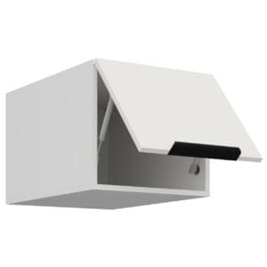 Měřte dostupný prostor pod stropem a nad pracovní plochou, aby rozměry skříňky (šířka 40 cm, výška 36 cm, hloubka 57 cm) odpovídaly místu instalace. Skříňka je dodána s černými kovovými úchytkami (360 mm) a plynovým pístem. Vnitřek skříňky je bílý a jsou připravené slepé otvory pro uchycení úchytek.