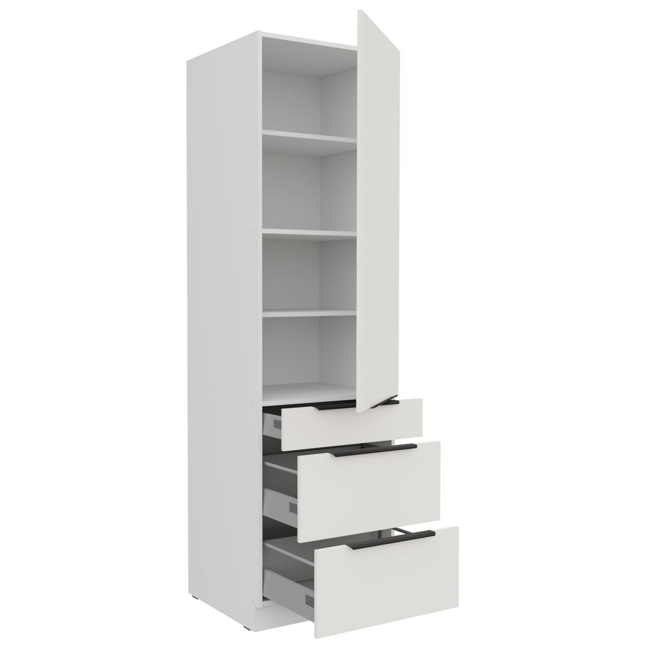 Vnitřek skříňky v bílé barvě. Skříňka má tři police. Slepé otvory pro úchytky. Dno zásuvky o tloušťce 16 mm v šedé barvě. Kovové boky zásuvek. |