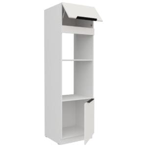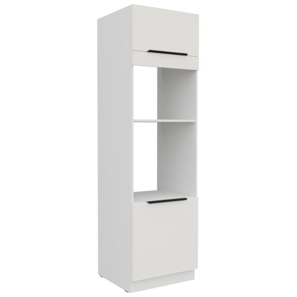 Vnitřek skříňky v bílé barvě. Skříňka má jednu polici. Slepé otvory pro úchytky. Skříňka na vestavnou troubu a mikrovlnku. |